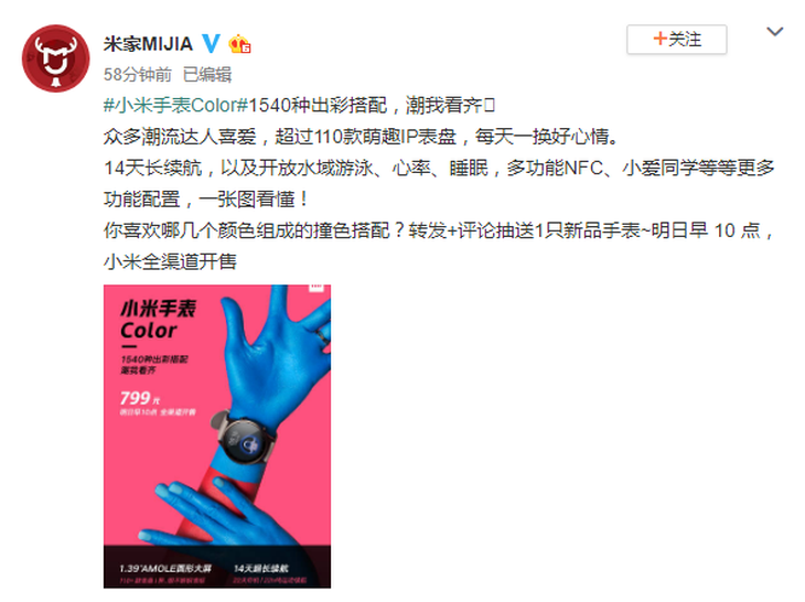 1月2日消息,小米手表Color作為小米近期即將推出的首款潮搭新品,自上月開始,@米家MIJIA 官微便發布了多條微博為這款新品預熱。米家官方在微博中表示,小米手表Color將于明日早10點正式在全渠道開售,售價799元。