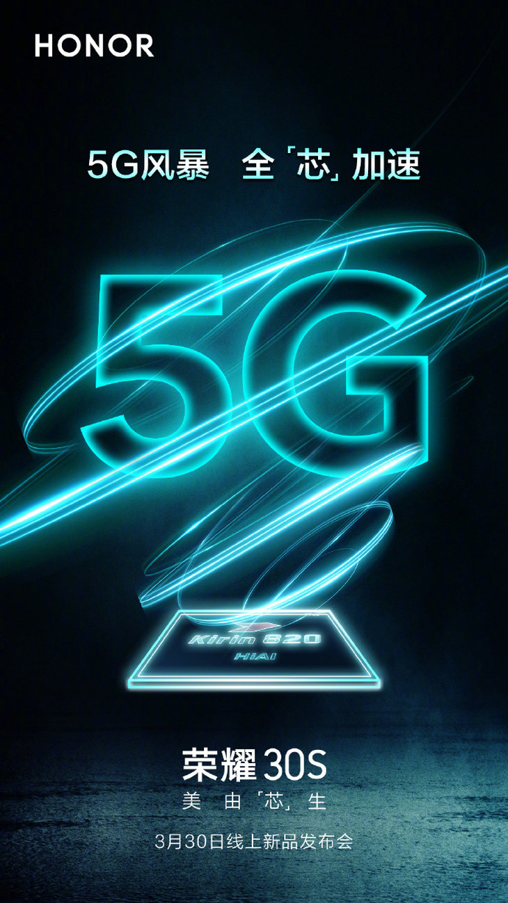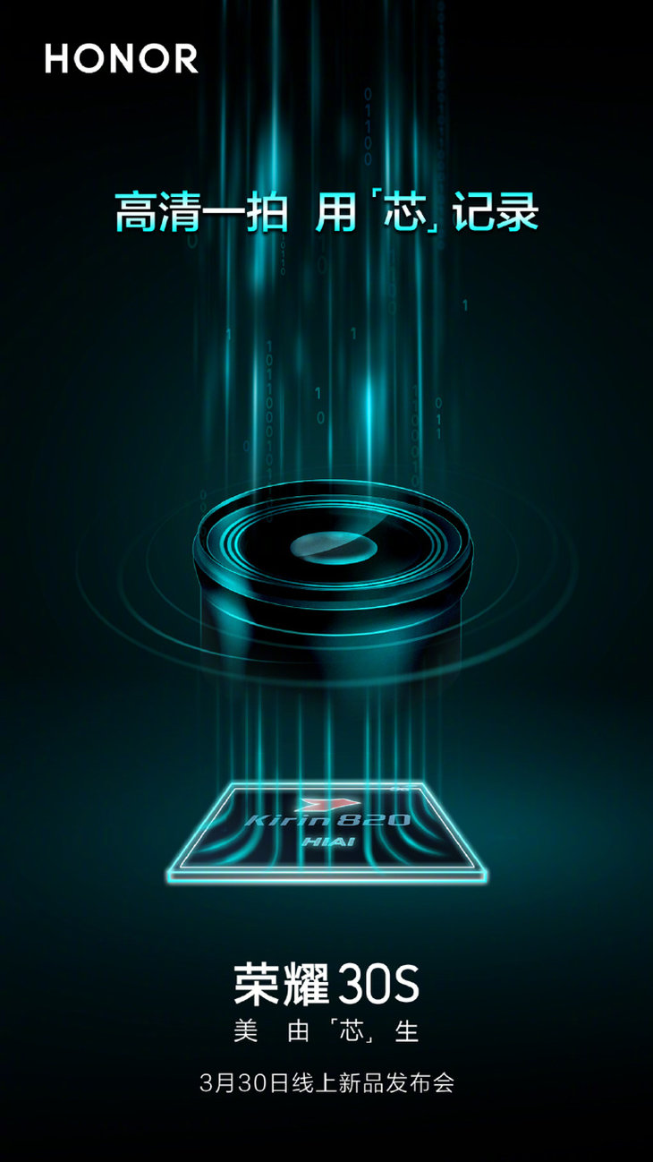 其他方面,根據海報可以看出榮耀30S似乎延續了上一代的指紋+電源二合一按鍵,機身上的物理按鍵全部集中在機身的右側,從上到下分別是音量鍵和電源鍵。不過機身的正面照片官方還未透露,預計仍采用挖孔屏設計。