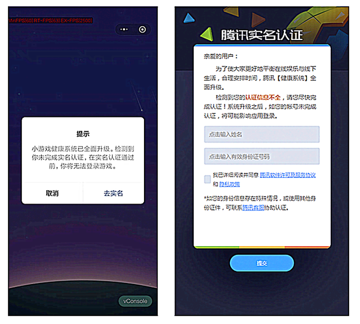 3月31日消息,今日騰訊微信小游戲健康系統全面升級,在進入微信小游戲時,系統會彈出用戶認證界面,必須輸入姓名和身份證信息才能繼續游戲,未經過實名認證的小伙伴無法順利進入小游戲。