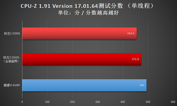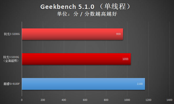 此項(xiàng)目,全面超頻之后的AMD銳龍3 3200G處理器在全核心性能方面與Intel酷睿i3-9100F比較接近,單核心性能也比較接近。