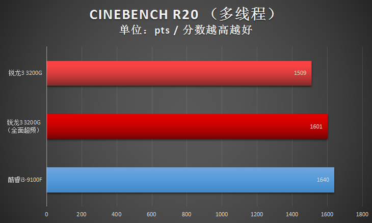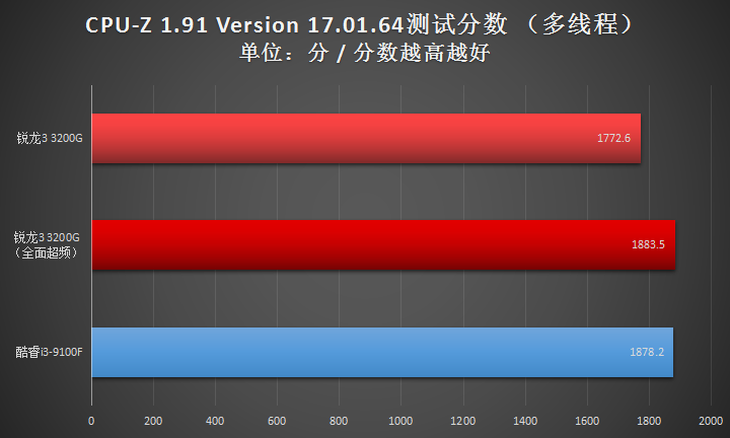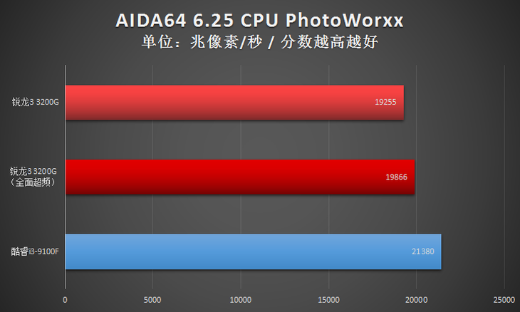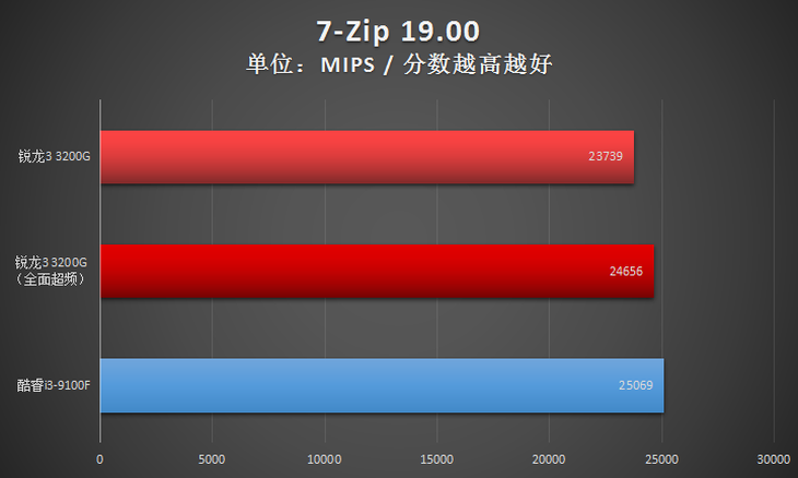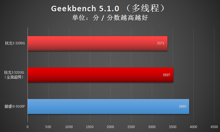此項(xiàng)目,全面超頻之后的AMD銳龍3 3200G處理器在全核心性能方面與Intel酷睿i3-9100F基本一致。