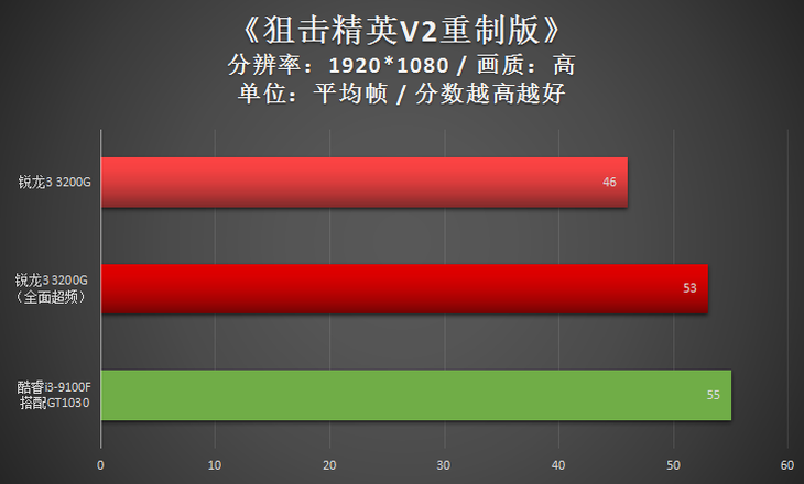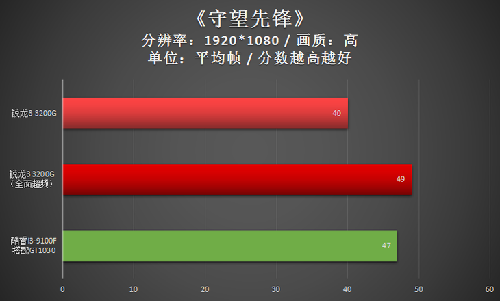 此款游戲,經(jīng)過(guò)全面超頻之后的AMD銳龍3 3200G與NVIDIA GeForce GT 1030基本一致。