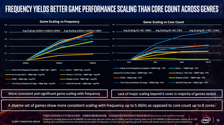 英特爾選了8款非常有代表性的游戲來做綜合的評(píng)估。大家先看趨勢(shì),下圖先看左邊,游戲性能的增強(qiáng)和頻率的關(guān)系在固定核數(shù)底下頻率的關(guān)系,從總體情況來看,我們看到是說,從3GHz到4GHz總體平均性能提升是20%,從4GHz到5GHz,8核都是4GHz,1-8核都是5GHz,性能提升10%。相對(duì)來講頻率的提升對(duì)于FPS(幀頻)提升相對(duì)比較明顯,所以英特爾講說,更好、更一致、更明顯的性能提升,頻率提升性能就有提升。