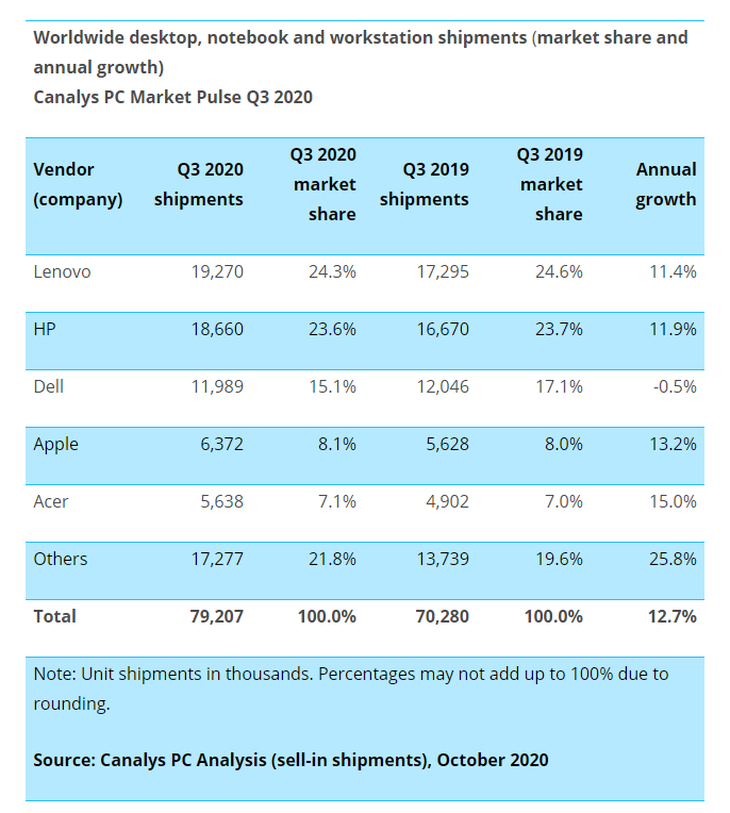 2020第三季度PC出貨增長13%,聯想繼續領跑