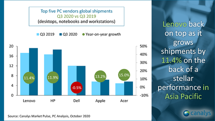分析公司Canalys在11月12日發表報告稱,2020年第三季度電腦制造商的個人電腦出貨量為7900萬臺,同比增長13%,其中聯想居首。