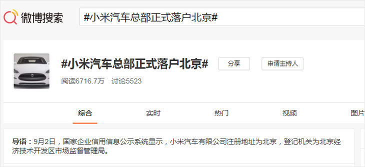 來自微博上面的新消息。9月2日,國家企業信用信息公示系統顯示,小米汽車有限公司注冊地址為北京,登記機關為北京經濟技術開發區市場監督管理局。