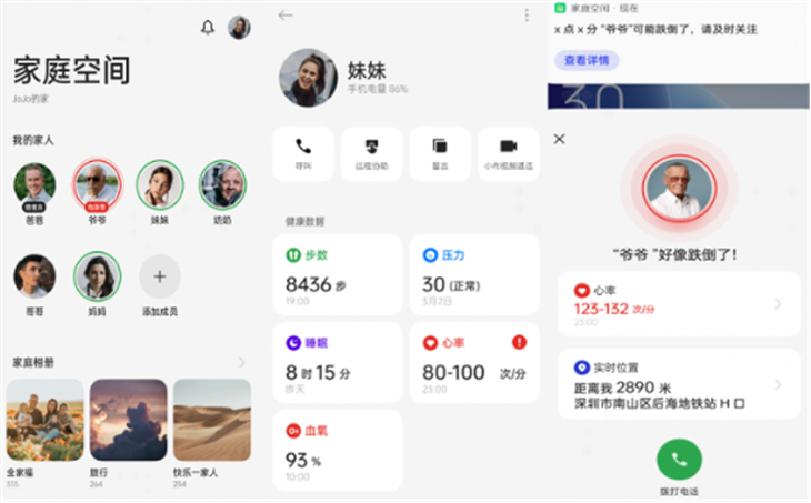 根據OPPO在大會上的介紹,家庭健康管理可ColorOS系統,聯動手機和手表等硬件設備,實現家庭成員的健康數據同步。用戶能夠在ColorOS家庭空間中實時查看家人的健康指標,包括心率、血氧飽和度、睡眠時長等;如果家人數據異常或被檢測到可能跌倒,其他成員會在第 一時間收到提醒,方便及時救援。