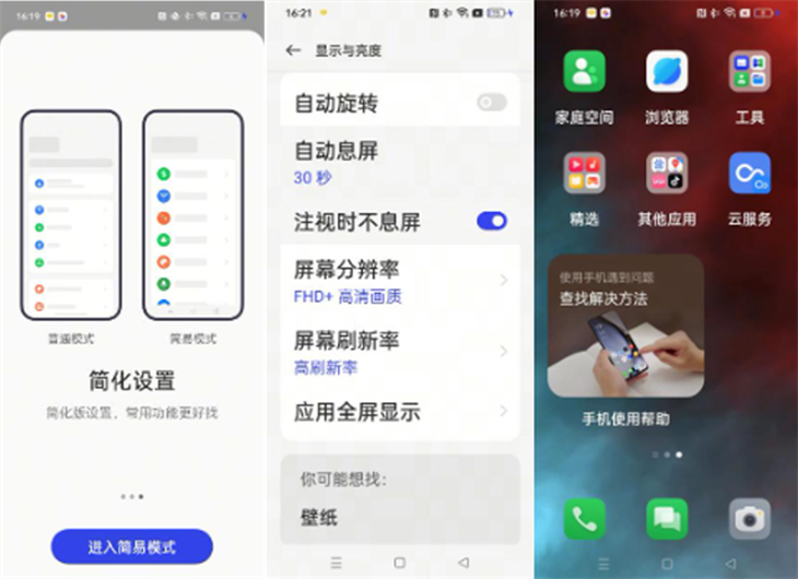 針對于老年群體使用需求,OPPO 在ColorOS上推出了簡易模式。簡易模式通過桌面模塊顯示優化,語音助手指導設置以及注視不息屏等功能,大幅降低了老年人使用智能手機的門檻。