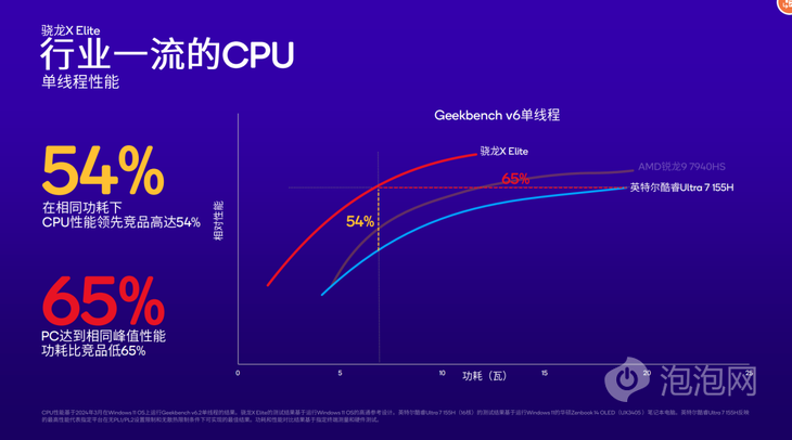 而與酷睿Ultra 7 155H相比,在Geekbench 6單線程測試中,驍龍X Elite達(dá)到相同峰值性能時(shí)的功耗比競品低65%,僅為酷睿Ultra 7 155H的1/3。另外,在相同功耗之下,驍龍X Elite的CPU性能比競品高54%。