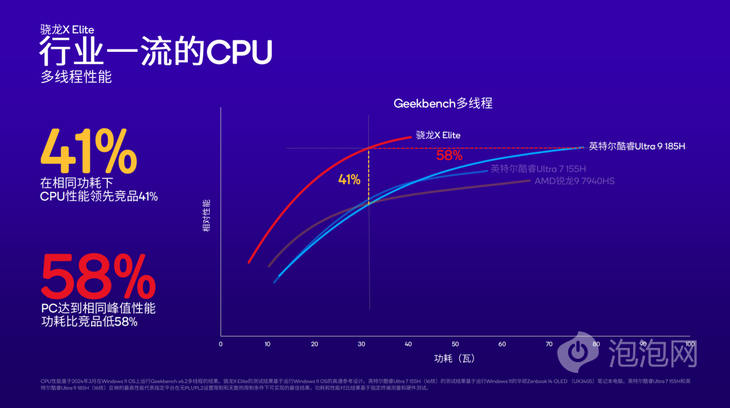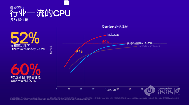 在多線程測試中,Geekbench v6多線程測試顯示,驍龍X Elite與英特爾酷睿Ultra 7 155H相比,達(dá)到相同峰值性能時(shí),功耗低60%;在相同功耗下,驍龍X Elite的CPU性能領(lǐng)先競品52%。