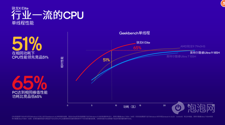 驍龍X Elite不僅在對(duì)比英特爾酷睿Ultra 7 155H時(shí)保持領(lǐng)先,在與更高端的英特爾酷睿Ultra 9 185H進(jìn)行對(duì)比時(shí),也具有領(lǐng)先優(yōu)勢(shì)。在單線程測試中,達(dá)到相同峰值性能時(shí)功耗低65%;在相同功耗下,性能領(lǐng)先競品高達(dá)51%。