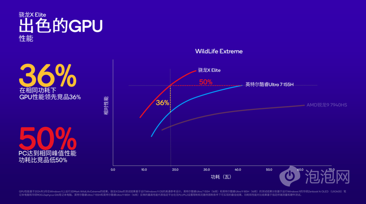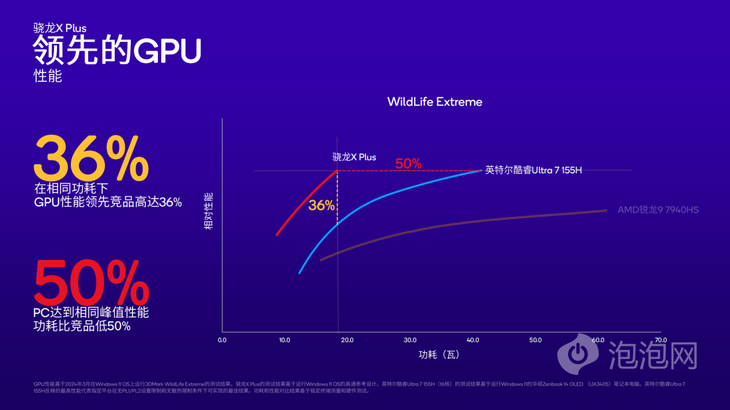 在WildLife Extreme測試中,與英特爾酷睿Ultra 7 155H相比,驍龍X Plus在相同功耗下的GPU性能領(lǐng)先競品高達(dá)36%,在PC達(dá)到相同峰值性能時(shí)的功耗僅為競品的一半。