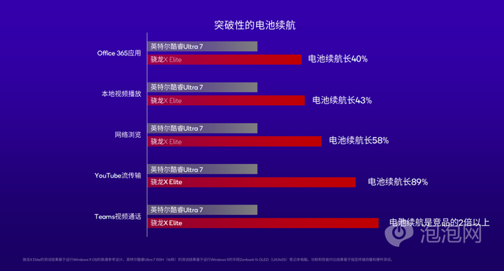 驍龍X Elite在性能和功耗方面的優(yōu)勢(shì)也讓設(shè)備具備更長的續(xù)航能力,高通針對(duì)一些主流應(yīng)用進(jìn)行的對(duì)應(yīng)的測試,數(shù)據(jù)顯示,在這些不同用例中,驍龍X Elite的電池續(xù)航對(duì)比英特爾酷睿Ultra 7 155H至少長40%。