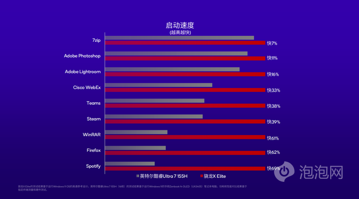 另一個(gè)衡量用戶體驗(yàn)的重要指標(biāo)就是平臺(tái)的響應(yīng)速度,在啟動(dòng)終端上的應(yīng)用時(shí),時(shí)延和首次打開所需的時(shí)間肯定是越短越好。在高通的測試中,驍龍X Elite都可以更快速地響應(yīng)并打開應(yīng)用,至少比英特爾酷睿Ultra 7 155H快7%,至多快接近70%。