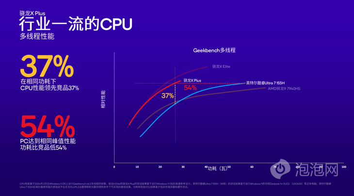 驍龍X Plus在Geekbench多線程測試中,表現(xiàn)優(yōu)于英特爾酷睿Ultra 7 155H,在達(dá)到相同峰值性能時(shí),驍龍X Plus的功耗比競品低54%。