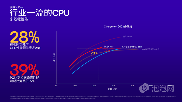 在Cinebench 2024多線程測試中,與英特爾酷睿Ultra 7 155H相比,驍龍X Plus在相同功耗下的CPU性能領(lǐng)先競品28%,在PC達(dá)到相同峰值性能時(shí)的功耗比競品低39%。對(duì)比英特爾酷睿Ultra 7 155H,驍龍X Plus同樣具有優(yōu)勢(shì)。