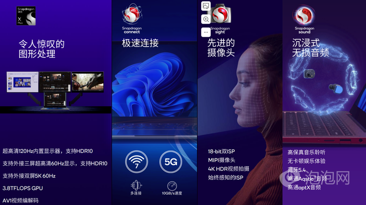 在影像方面,驍龍X Plus也支持領(lǐng)先的影像特性,包括支持18-bit雙ISP和MIPI攝像頭,為高端的用戶體驗(yàn)提供先進(jìn)的圖像和視頻功能。驍龍X Plus支持領(lǐng)先的Snapdragon Sound特性,包括藍(lán)牙5.4音頻傳輸?shù)取?/p>