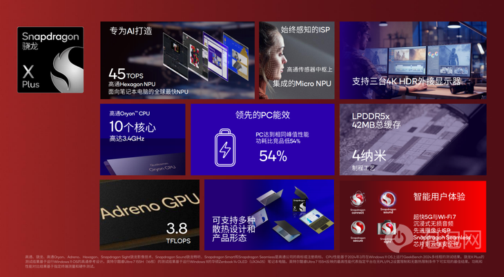 在其他體驗(yàn)方面,驍龍X Plus能夠支持外接三屏超高清4K 60Hz顯示,并支持HDR10。網(wǎng)絡(luò)上則支持包括Wi-Fi 7、高頻并發(fā)多連接、和支持Sub-6GHz以及毫米波的速度可以達(dá)到10GB/s的5G連接。