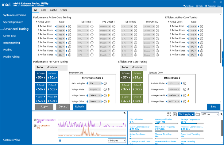 除了一鍵超頻,玩家也可以自行嘗試手動(dòng)超頻。啟動(dòng)英特爾XTU這款軟件,在高級(jí)模式下,點(diǎn)擊進(jìn)入“Advanced Tuning”界面,便可以對(duì)處理器進(jìn)行手動(dòng)超頻操作。