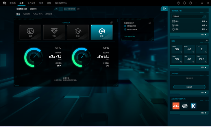 其中,極速模式是這款游戲本的至高性能模式,在該模式下,會(huì)自動(dòng)對(duì)獨(dú)立顯卡進(jìn)行超頻。