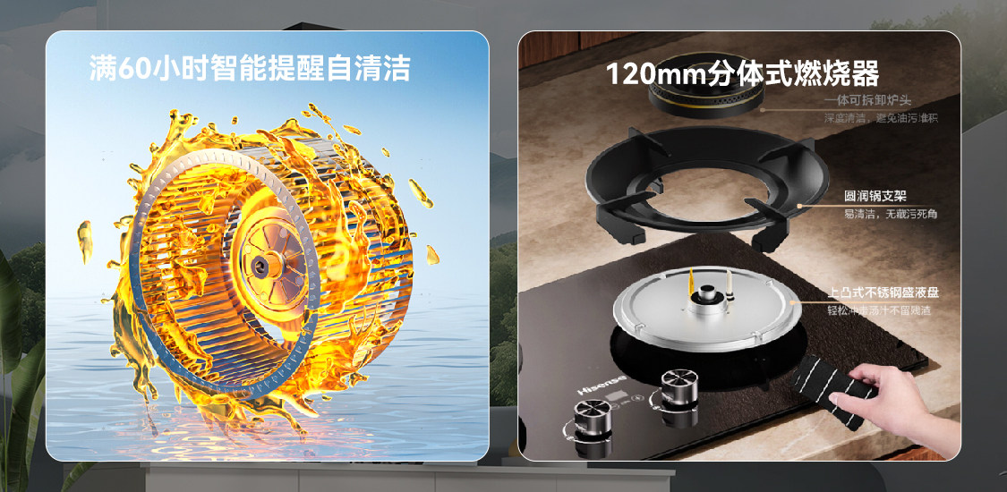 日常維護(hù)上,海信凈魔方E套系省心省力。傳統(tǒng)灶具一體式燃燒器清潔時需整體抬起,費(fèi)力易損。而海信凈魔方E套系灶具配備120mm分體式精銅燃燒器,可分解清理,精銅材質(zhì)耐腐蝕、抗氧化,油污不易附著,經(jīng)久耐用;煙機(jī)搭載60小時智能提醒自清潔功能,機(jī)體采用磁吸式易開合擋油板設(shè)計,一拉即取,清潔輕松,能為打工人爭取更多休息時間。