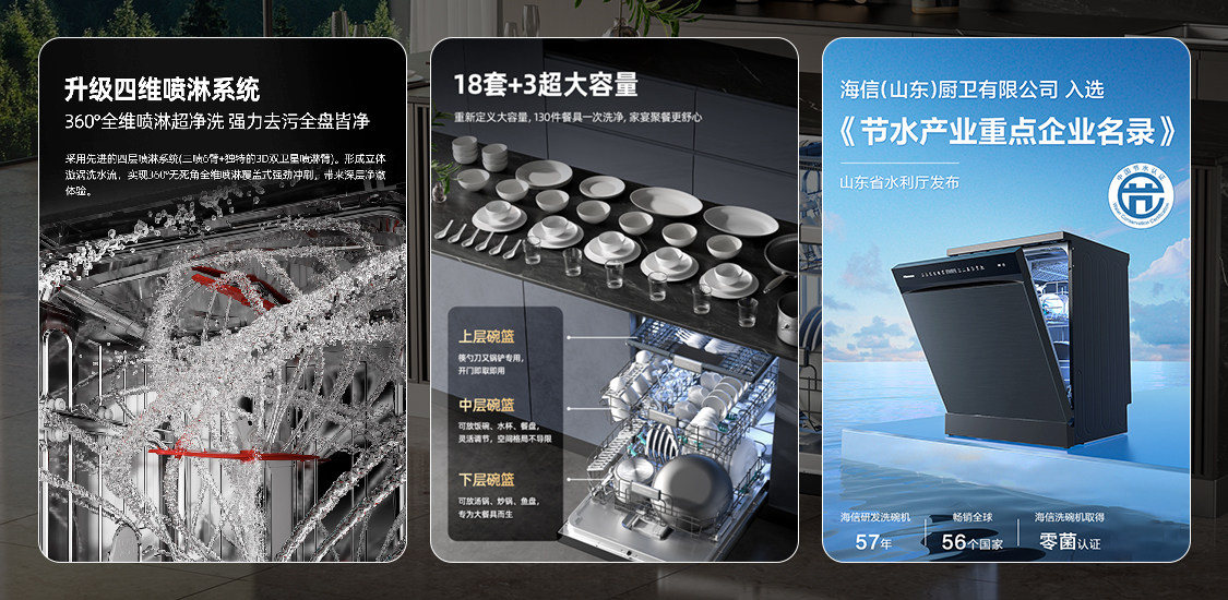 它支持分層洗功能,可根據餐具數量選擇單層清洗,實現“少碗少洗、多碗全洗”的精準清潔模式。配合中央環噴洗與3D雙衛星噴淋臂,水流可實現360°無死角清洗覆蓋。再加上60000Pa高壓變頻沖洗系統,能在提升清潔力的同時精準控水控能,做到“既省又凈”。18套+3大容量的設計,讓全家一日三餐的餐具一次清洗無壓力,聚餐大量鍋碗瓢盆也能輕松容納。憑借在節水節能技術上的創新突破,海信廚電更成功入選“山東省節水產業重點企業名錄”,以科技創新詮釋綠色、可持續的生活理念,提升了家庭日常的幸福感。