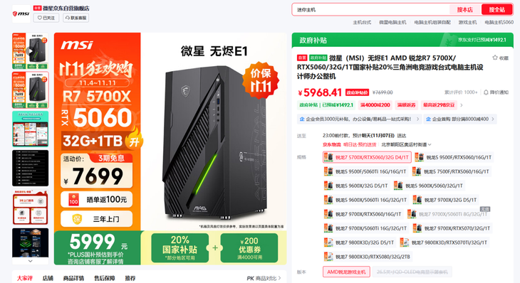 最后這款微星整機可選性極高,可以說AMD爆款銳龍處理器全家桶都可以選擇到,搭配的主板和顯卡都是來自微星科技的非公版產品,內存和SSD均可以按照用戶們的需求進行加購升級,機箱采用的是高效散熱的微星無燼E1。目前這款整機享受20%國補,還有優惠券可以領取,三期免息曬單還返E卡。