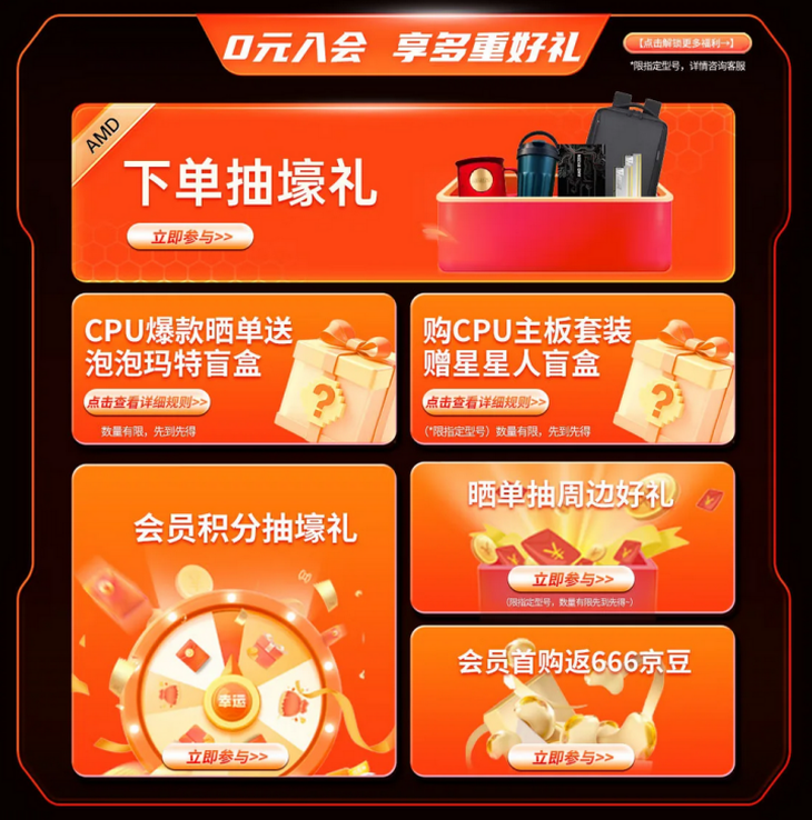 參與AMD京東自營旗艦店11.11終極大促的朋友們,還是建議大家成為AMD京東自營旗艦店的會員,加入會員之后就可以解鎖一系列的福利了,CPU爆款曬單送泡泡瑪特盲盒,購CPU主板套裝贈星星人盲盒。會員下單抽壕禮,曬單還可以抽周邊好禮,會員首購返666京豆,會員積分還能再抽壕禮,誠意滿滿的禮物已經備好,請大家千萬不要錯過這些限時福利哦!