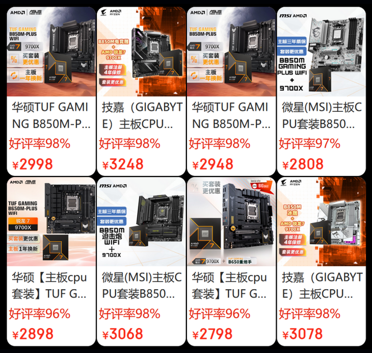 除了爆品CPU單品之外,活動頁面有很多AMD銳龍處理器的板U套裝和卡U套裝,這些結合了AMD和合作伙伴芯片組產品和顯卡產品的套裝不僅搭配起來相得益彰,套裝價格更是優惠,方便大家一站購全想要的硬件產品。
