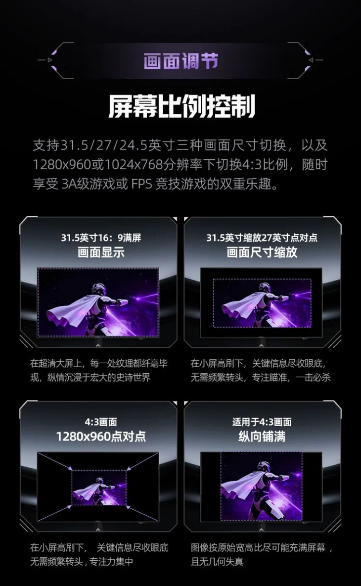 針對多任務與專業競技需求,AGP327UZD 支持 PBP 雙畫面和 PIP 畫中畫功能,可實現多源信號同步顯示,讓用戶能夠邊游戲邊查資料或處理工作任務。KVM 一鍵切換功能讓雙設備共用一套鍵鼠,辦公與娛樂切換自如,無需頻繁插拔,極大提升工作與游戲效率。同時,支持31.5/27/24.5英寸三種畫面尺寸切換,以及1280x960或1024x768分辨率下切換4:3比例,隨時享受3A 級游戲或FPS 競技游戲的雙重樂趣。