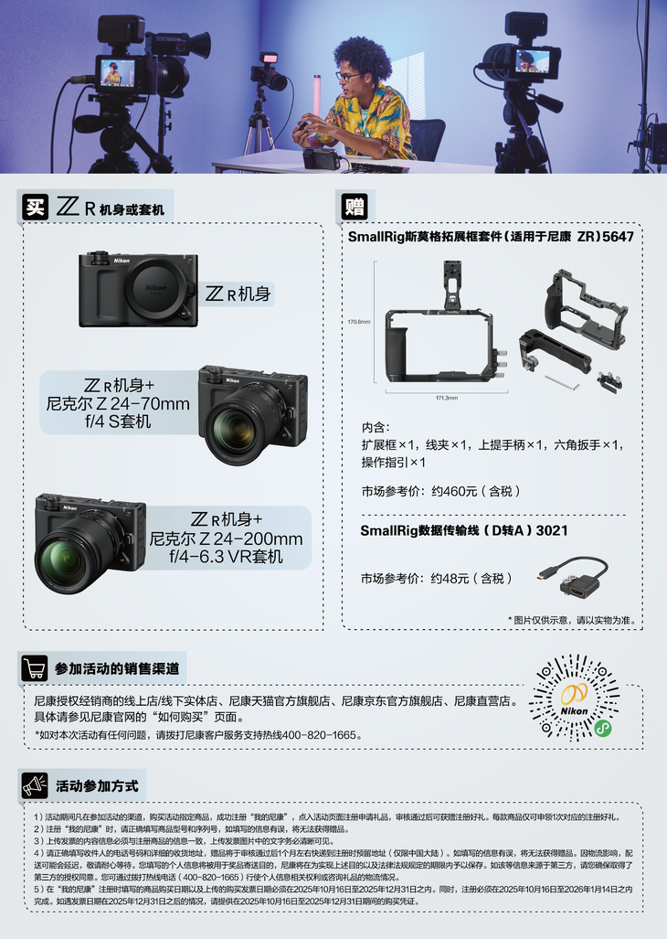 活動期間,凡通過指定銷售渠道購買尼康ZR機身或套機的用戶,在完成“我的尼康”微信小程序注冊并通過審核后即可獲贈SmallRig斯莫格拓展框套件(適用于尼康ZR)5647一套(內含擴展框×1,線夾×1,上提手柄×1,六角扳手×1,操作指引×1,市場參考價:約460元(含稅))和SmallRig數據傳輸線 (D轉A) 3021一條(市場參考價:約48元(含稅))。