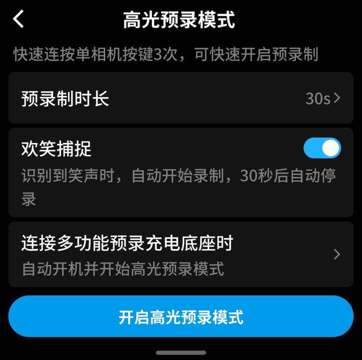 在開啟GO Ultra的“高光預(yù)錄”功能后,相機將進入持續(xù)緩存狀態(tài)。按下快門后,相機可以留存快門按動前的精彩畫面,用戶可以根據(jù)拍攝檔位選擇10秒、15秒、30秒、40秒等預(yù)錄制時長。