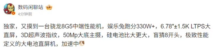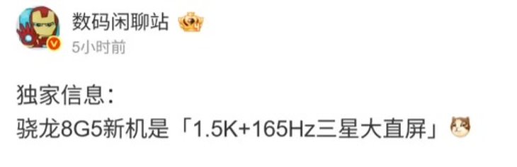 數碼圈知名博主 @數碼閑聊站 今日在微博放出重磅爆料,一款搭載驍龍 8 Gen5 芯片的新機將配備 1.5K 分辨率、165Hz 刷新率的三星大直屏。結合博主暗示及評論區用戶猜測,這款機型大概率是 realme 真我 Neo8。