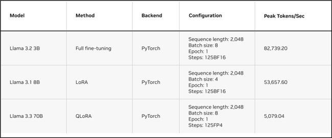 下表展示了在 DGX Spark 上對 Llama 系列模型進行微調的性能表現。