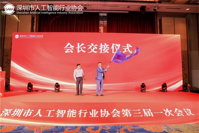 劉志雄董事長(右)從肖京會長(左)手中接過協會大旗,成為深圳市人工智能行業協會新任會長