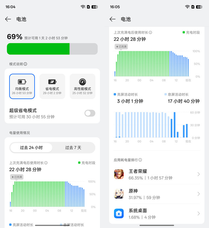日常使用場(chǎng)景下,官方宣稱連續(xù)刷抖音可堅(jiān)持30小時(shí);實(shí)測(cè)數(shù)據(jù)顯示,一加Turbo 6的續(xù)航能力遠(yuǎn)超同檔機(jī)型,在重度游戲體驗(yàn)測(cè)試下,《王者榮耀》滿幀+極致畫質(zhì)連玩2小時(shí),然后《原神》最高畫質(zhì)1小時(shí)后,剩余電量依然還剩余70%左右。這樣的表現(xiàn)完全可以滿足用戶從早到晚的重度使用需求,徹底擺脫電量焦慮。