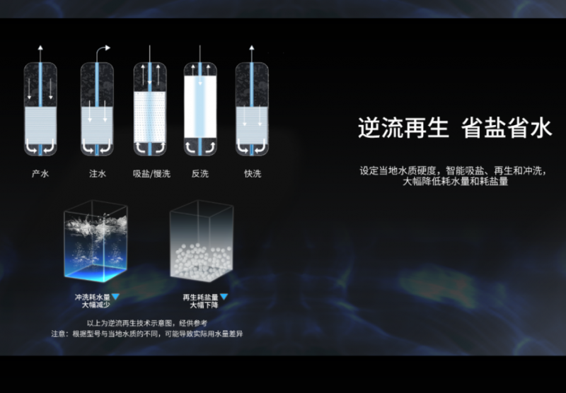 智能化再生過程,根據水質硬度自動判斷吸鹽量,精確再生。智能調節沖洗水量,確保高效徹底。簡化使用步驟,降低耗水量和耗鹽量,節能環保。