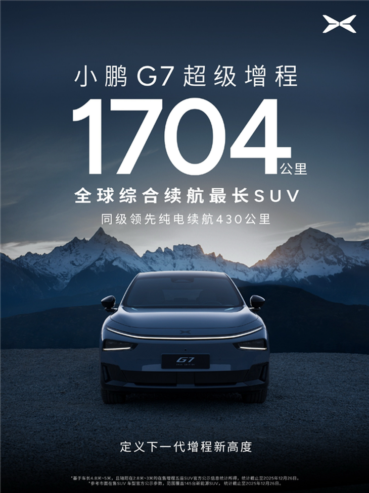 今日,小鵬汽車在廣州舉行2026全球新品發布會,正式推出四款全新車型,包括2026款小鵬P7+、小鵬G7超級增程以及經過煥“芯”升級的2026款小鵬G6和小鵬G9。其中,小鵬G7增程版的綜合續航可達1704公里,成為全球續航最長的SUV。在零下20攝氏度的極寒環境下,該車型經過實測,續航仍可達到1108.3公里。