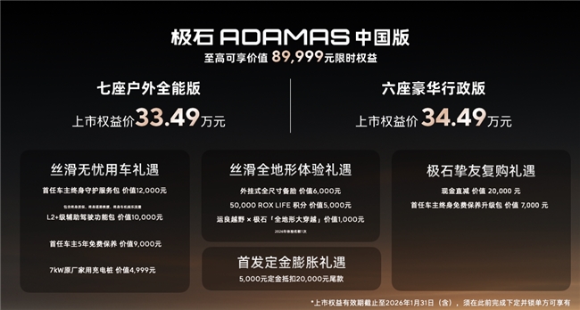 2025年12月28日,北京,極石汽車正式揭開了其面向全球市場的旗艦車型——極石ADAMAS中國版的神秘面紗。新車共推出七座戶外全能版與六座豪華行政版兩款配置,官方指導價分別為34.99萬元與35.99萬元。為回饋首批用戶,極石汽車提供了極具誠意的上市權益,兩款車型的上市權益價分別為33.49萬元和34.49萬元。更為重磅的是,即日起至2026年1月31日前下訂并鎖單,用戶可享受包含定金膨脹(5,000元定金直接抵扣20,000元尾款)、用車無憂禮包等在內的至高價值89,999元的限時專屬權益。