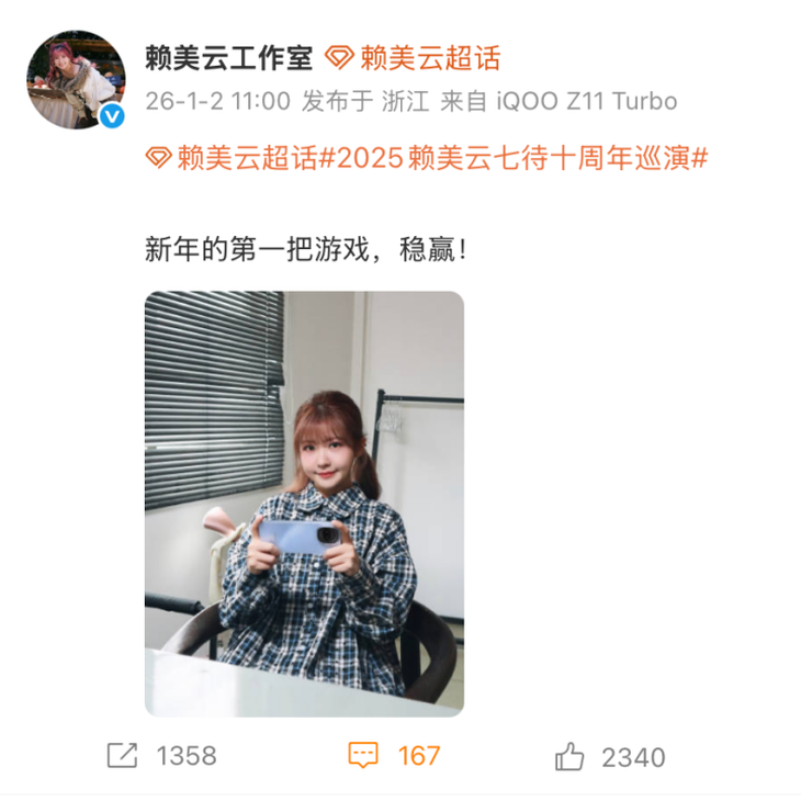 @賴美云工作室 在早前的微博中曬出與iQOO Z11 Turbo同框的游戲畫面,并配文:「新年的第 一把游戲,穩(wěn)贏!」瞬間點(diǎn)燃粉絲熱情,評(píng)論區(qū)迅速刷屏「戰(zhàn)斗精靈配小七,絕了!」「這手機(jī)和她一樣又美又能打」。