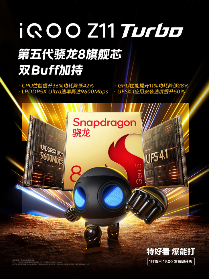 性能層面,iQOO Z11 Turbo可謂「武裝到牙齒」。當(dāng)日發(fā)布的芯片數(shù)據(jù)海報(bào)顯示,其搭載的第五代驍龍8移動(dòng)平臺(tái),CPU性能提升36%,功耗降低42%;GPU性能提升11%,功耗降低28%,更有LPDDR5X Ultra和UFS 4.1雙BUFF加持,跑分超359萬分,挑戰(zhàn)行業(yè)同平臺(tái)最高紀(jì)錄。