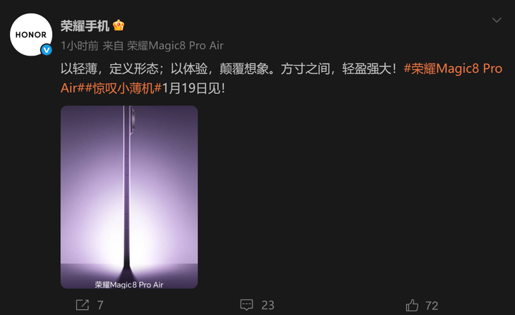榮耀Magic8 Pro Air官宣!6.1mm厚+5500mAh電池