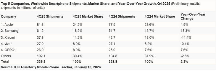 1月14日 ,國際數據公司IDC 發布2025年全球智能手機市場跟蹤報告, 2025年全球智能手機總出貨量累積12.6億部,同比增長1.9%,智能手機市場延續復蘇態勢。第四季度受高端手機的持續增長以及消費者預期價格上漲的積極影響,出貨量達3.363億部,同比增長2.3%。