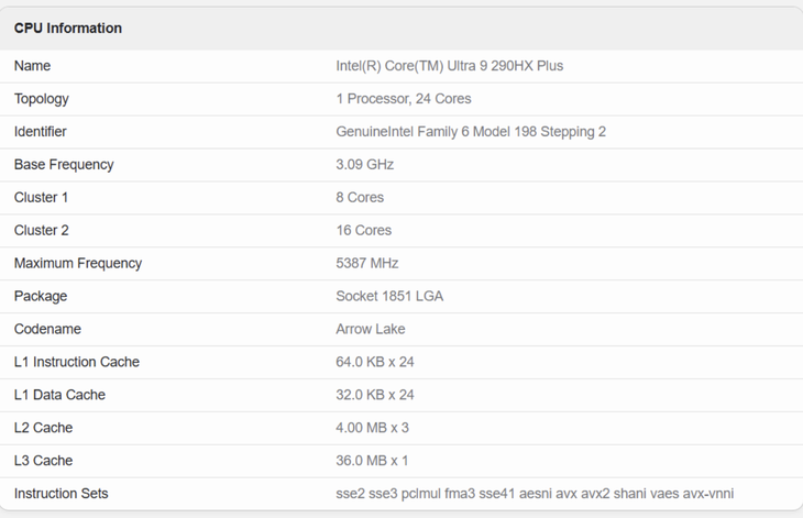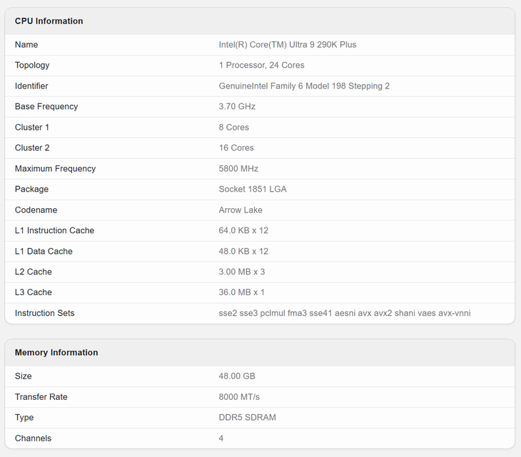 根據GeekBench數據庫的信息顯示,這兩款處理器均采用8P+16E共24核心設計,規格與酷睿Ultra 9 285K/285HX一致,顯然此次升級主要還是針對頻率以及表現進行優化。具體來看,Ultra 9 290K Plus搭載于技嘉Z890 AORUS TACHYON ICE主板,搭配48GB DDR5-8000內存;Ultra 9?290HX Plus則由宏碁新款Predator掠奪者游戲本搭載。