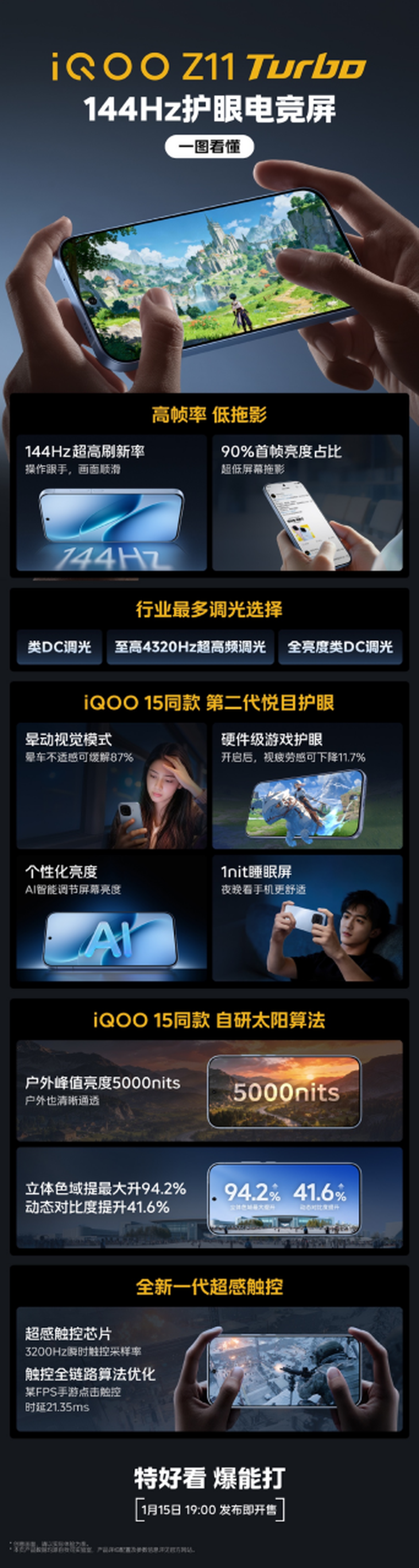 2026開年爆款預定的中端旗艦iQOO Z11 Turbo即將在明天(1月15日)正式發(fā)布并開售,今天,iQOO官方微博發(fā)文揭曉最后一個核心賣點——“144Hz護眼電競屏”。
