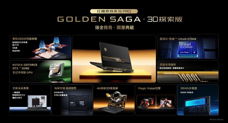 在游戲本上,紅魔游戲本16 Pro全新升級GOLDEN SAGA·3D探索版,搭載英偉達5090顯卡,擁有64GB+2TB存儲,并且首次在筆記本上帶來了流金水冷設計。