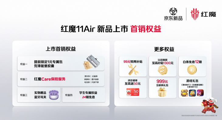 首銷期間,用戶下單即享專屬福利:提前鎖定1元專屬包(紅魔氘鋒能量膠囊)、紅魔Care保險服務、藍牙耳機、99元轉網補貼、以舊換新至高補貼1300元、999元互聯網禮包、評價曬單至高返50元、《全明星覺醒》、《我叫MT》、《我叫MT4》等游戲禮包、白條免息12期、學生更有專屬24期免息福利。