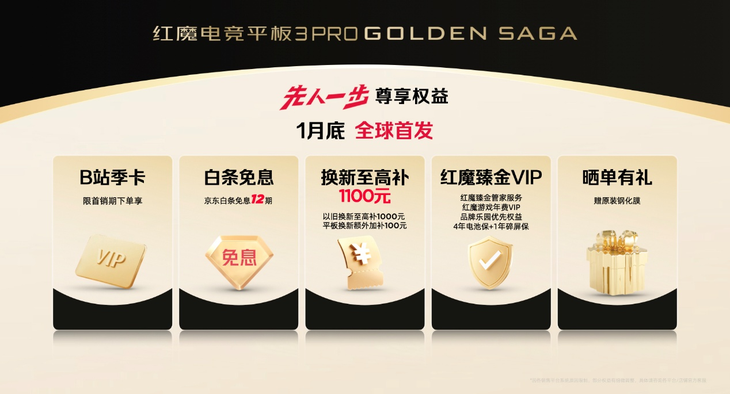 而紅魔電競平板3 Pro 臻金傳奇同樣搭載24GB+1TB的頂配存儲組合,配備紅魔 11 Pro+ 臻金傳奇同款臻金裝備,預計1月底全球首發,上京東先人一步首銷尊享B站季卡、12期白條免息、以舊換新至高補貼1100元,紅魔臻金VIP、曬單有禮等權益。