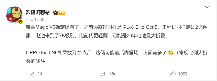 續(xù)航最強折疊屏 榮耀Magic V6電池將突破7000mAh