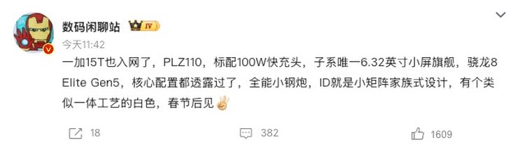 近日,一加全新機型一加15T已正式完成入網登記,機型代號為PLZ110,同步確認將配備100W快充頭,為用戶帶來高效補能體驗。據行業爆料,這款定位“全能小鋼炮”的新機,預計將在春節之后正式發布,其核心亮點的是,它將成為目前子系品牌中唯一一款搭載6.32英寸小屏的旗艦機型,精準填補小屏旗艦市場的細分空白。